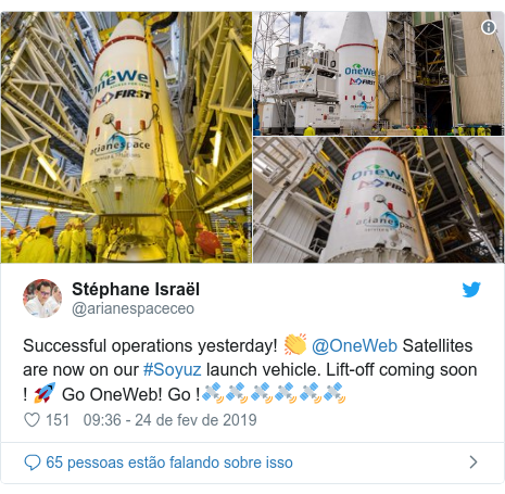 “Operações bem sucedidas ontem (sábado)! Os satélites da @OneWeb estão agora no nosso veículo de lançamento #Soyuz. Lançamento em breve! Vai OneWeb! Vai !”, escreveu ele.