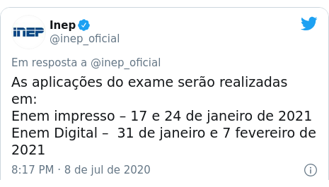 A prova impressa será realizada em 17 e 24 de janeiro de 2021. A prova digital ficou para 31 de janeiro e 7 de fevereiro.